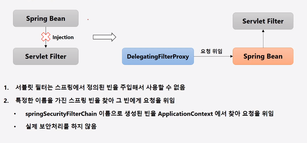 DelegatingFilterProxy 는 Servlet Filter 이며, DelegatingFilterProxy 가 특정한 이름을 가진 Spring Filter Type Bean을 찾아 요청을 위임한다.