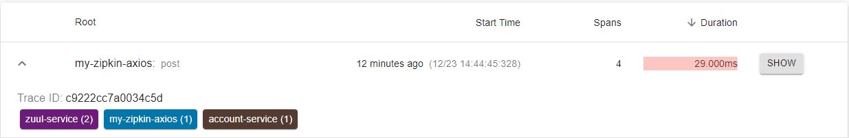 Zipkin 에 뜨지않던 Axios 호출이 export 되어 찍히기 시작한다.