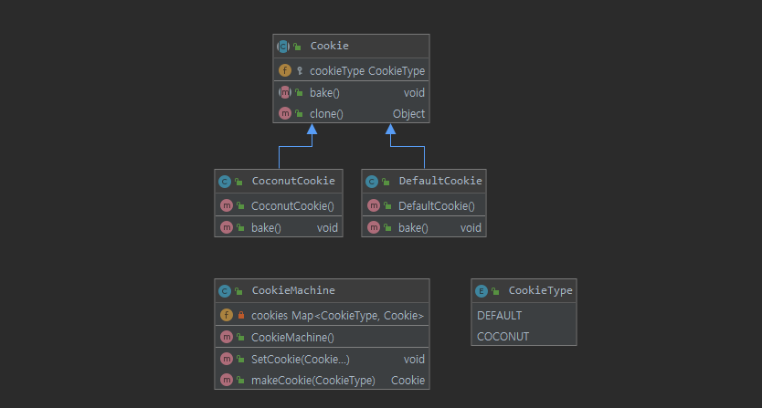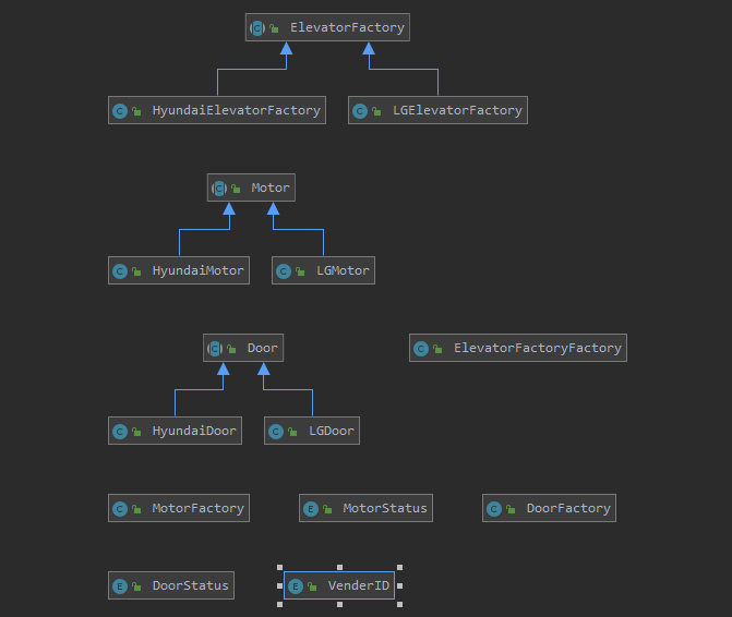 구체적 클래스에 의존하는 것이 아닌 서로 연관되거나 의존된 객체들의 조합을 만드는 인터페이스를 제공한다. 관련있는 객체들을 일관된 방식으로 생성하는 경우 유용 싱글톤, 팩토리 메서드 패턴을 사용한다. 일관된 방식으로 객체를 생성할 경우 요구사항이 늘어날 수록 팩토리 클래스가 늘어나는 것을 방지해준다. 추상화 된 Door 에서 상속 되어 나오는 벤더 제품을 만들고 있다. 공통기능은 템플릿 메서드로 획일화 시킨다. public abstract class Door { private DoorStatus doorStatus; public Door() { doorStatus = DoorStatus.CLOSED; } public DoorStatus getDoorStatus() { return doorStatus; }..