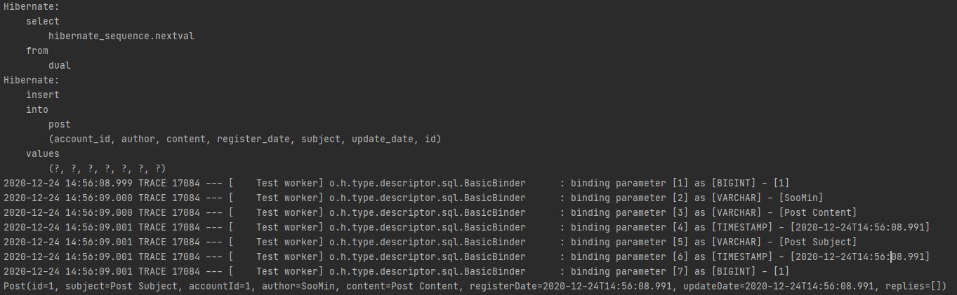하이버네이트 5.2 이상 부터 Entity 의 수정일과 등록일을 관리해주는 어노테이션을 제공한다. Java8 에서 지원하는 시간 클래스를 사용할 수 있게 끔 해주고 있다. @Entity @Getter @Setter public class Reply { @Id @GeneratedValue private Long id; private String subject; @Column(unique = true) private Long accountId; private String author; private String content; @CreationTimestamp private LocalDateTime registerDate; @UpdateTimestamp private LocalDateTime updateDa..